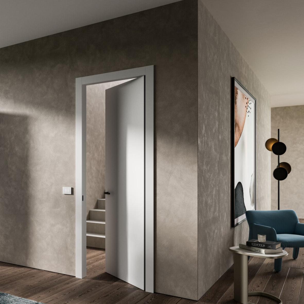 De deur die vlak met de muur wordt geplaatst, is een moderne en innovatieve oplossing die stijl en oog voor detail uitstraalt. De deuren van DoorArreda sluiten perfect aan met de wand, waardoor je een volledig geïntegreerde en naadloze look creëert door dezelfde afwerking toe te passen op zowel deur als muur.